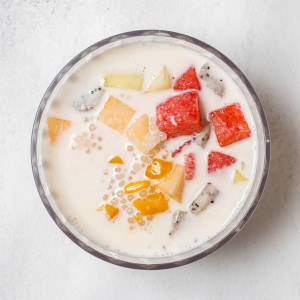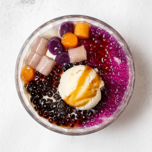 a refreshing and unique dessert. This treat features chewy black sugar pearls, tangy lemon, and smooth, jelly-like Ai-Yu, creating a perfect balance of sweet and sour flavors. A delightful and cooling dessert, perfect for warm weather enjoyment.